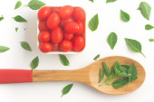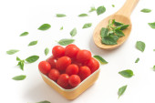 Ekologiczne pomidory Sugardrop na winorośli z bazylią w oilve płyta drewno i łyżeczka z pieprzu na białym tle. Miejsca na tekst
