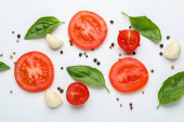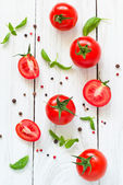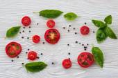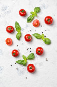 Organiczne Mini San Marzano pomidorów na winorośli z bazylią i pieprz na białym tle