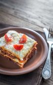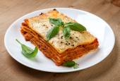 Kawałek smaczne gorące lasagne z czerwonego wina. Mała głębia ostrości.