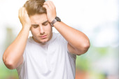 Młody przystojny mężczyzna w okularach na białym tle cierpiących ból głowy, zdesperowany i zestresowani, bo bóle i migreny. Ręce na głowę.