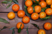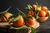 Świeże, dojrzałe mandarynki z zielonych liści i drewniany kosz na stole