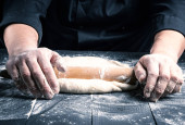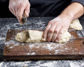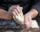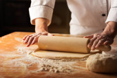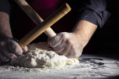 drewnianym wałkiem w męskie ręce, następny jest rozproszone mąki białej pszennej