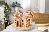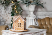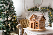 Piernika na stole. Rozmyte lampki na choinkę. Rano w jasnym salonie. Świąteczny nastrój.