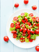 Sałatka jarzynowa wegetariańska zdrowy świeżej sałaty, ogórek, papryka i pomidory. Na bazie roślin wegańskie. Układ płaski. Widok z góry