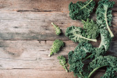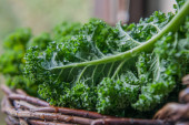 Jarmuż zielony w koszyku na podłoże drewniane widok z góry na światło dzienne pożywienie warzyw