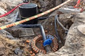 Zdjęcie "Wykopali głęboki rów narzędzia inżynierii systemów miejskich. System alarmowy miejskich urządzeń sanitarnych i grzewczych. Rów jest wypełniona rusty wybuchu brudnej wody z potoku. Naprawy pracy sieci inżynieryjnych" może być wykorzystywane do celów osobistych i komercyjnych zgodnie z warunkami zakupionej licencji Royalty-free. Obraz jest dostępny do pobrania w jakości wysokiej rozdzielczości do 5760x3840.