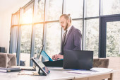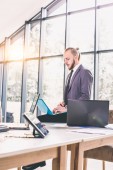 Młody człowiek pracy z laptopa, notebooka w ręce mężczyzny, biznes osobiście w miejscu pracy