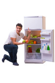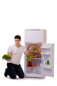 Młody człowiek z apple w pobliżu otwartą lodówką na białym tle