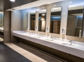 Zdjęcie "Wnętrze łazienki w jasnych kolorach beżu i bieli. Okrągłe umywalki ceramiczne. Lusterka, plastikowe mydła danie i chromowane baterie do mycia rąk po WC. Projektowanie z ciemne Płytki licowe." może być wykorzystywane do celów osobistych i komercyjnych zgodnie z warunkami zakupionej licencji Royalty-free. Obraz jest dostępny do pobrania w jakości wysokiej rozdzielczości do 5760x3840.