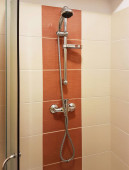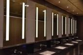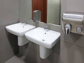 Wnętrze łazienki w jasnych kolorach beżu i bieli. Okrągłe umywalki ceramiczne. Lusterka, plastikowe mydła danie i chromowane baterie do mycia rąk po WC. Projektowanie z ciemne Płytki licowe.