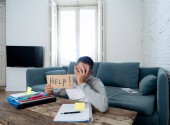 Martwi się i rozpaczliwy kobieta prosi o pomoc spłaty długów i pożyczki obliczania rachunki podatkowe wydatków i rachunkowości finanse domu siedzi na kanapie w krajowych rachunków i koncepcja problemy finansowe.