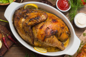 Zdjęcie "Uroczysty żywności. Pieczonego kurczaka faszerowane szynką i pieczarkami. Serwowane pyszne kurczaka nadziewane na uroczysty obiad na stole." może być wykorzystywane do celów osobistych i komercyjnych zgodnie z warunkami zakupionej licencji Royalty-free. Obraz jest dostępny do pobrania w jakości wysokiej rozdzielczości do 5760x3840.