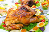 Uroczysty żywności. Pieczonego kurczaka faszerowane szynką i pieczarkami. Serwowane pyszne kurczaka nadziewane na uroczysty obiad na stole.