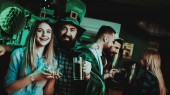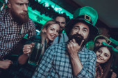 Black Brodaty mężczyzna z firmy. St Patrick's Day. Bar licznika. Obsługa alkoholu. Uśmiechający się nastolatków. Dobry nastrój Świąteczny. Jasne światła. Odwiedzający śmieszne Club. Świętujemy razem. Noc stroną.