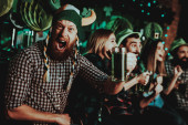Człowiek w śmiesznym kapeluszu obchodzi St Patrick's Day. Bar licznika. Obsługa alkoholu. Ginger brodę. Uśmiechnięty mężczyzna. Dobry nastrój Świąteczny. Jasne światła. Gościem klubu śmieszne. Otwarte usta. Szklanka piwa.