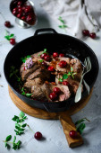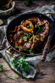 Policzki wołowe w czerwonym winie z marchewki i ziemniaków gratin.selective ostrości