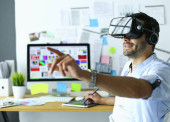 Zdjęcie "Młody programista męski testujący nową aplikację z okularami 3D wirtualnej rzeczywistości w biurze." może być wykorzystywane do celów osobistych i komercyjnych zgodnie z warunkami zakupionej licencji Royalty-free. Obraz jest dostępny do pobrania w jakości wysokiej rozdzielczości do 5760x3840.