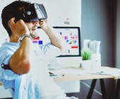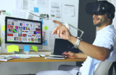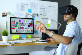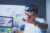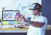 Młody programista męski testujący nową aplikację z okularami 3D wirtualnej rzeczywistości w biurze.
