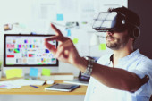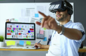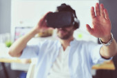 Zdjęcie "Młody programista męski testujący nową aplikację z okularami 3D wirtualnej rzeczywistości w biurze." może być wykorzystywane do celów osobistych i komercyjnych zgodnie z warunkami zakupionej licencji Royalty-free. Obraz jest dostępny do pobrania w jakości wysokiej rozdzielczości do 5760x3840.
