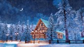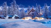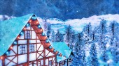 Zimowej scenerii w akwarela z śniegiem oświetlony, szachulcowy dom wsi, wśród ośnieżonych jodły wysokiej w alpejskich gór w snowy nocy. Sztuka cyfrowa painting od mojego pliku 3d renderowania.