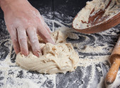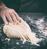 Mąka pszenna biała okrągłe ciasto i drewnianym wałkiem w męskie ręce