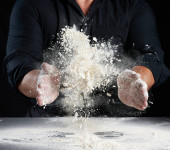 białej mąki pszennej na czarny drewniany stół i dwa męskie dłonie, z bliska