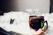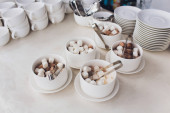 wiele wierszy czyste białe filiżanka i spodek z łyżeczki, odbicie na stole