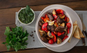 Zdjęcie "Pieczone mięso wieprzowe całe pomidory, fasola szparagowa i czarne oliwki, danie domu przytulne zimowe w garnku. Boże Narodzenie żywności, pyszne danie główne" może być wykorzystywane do celów osobistych i komercyjnych zgodnie z warunkami zakupionej licencji Royalty-free. Obraz jest dostępny do pobrania w jakości wysokiej rozdzielczości do 5760x3840.