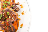Pieczone mięso wieprzowe całe pomidory, fasola szparagowa i czarne oliwki, danie domu przytulne zimowe w garnku. Boże Narodzenie żywności, pyszne danie główne
