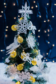 Beautiful ozdobione choinki z śniegu na niewyraźne wieńca. Tło wakacje