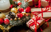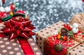 Prezenty świąteczne w śniegu pod drzewem. Pojęcie domu wakacje, niespodzianek i obecnie