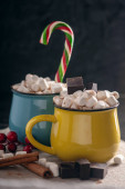 Zdjęcie "Boże Narodzenie czerwony kubek gorącej czekolady i kawy z pianką z choinki jodła rozgałęzia się na czarnym tle. Boże Narodzenie wakacje." może być wykorzystywane do celów osobistych i komercyjnych zgodnie z warunkami zakupionej licencji Royalty-free. Obraz jest dostępny do pobrania w jakości wysokiej rozdzielczości do 5760x3840.