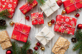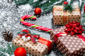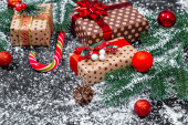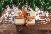 Prezenty świąteczne z gałęzi choinki i śnieg na drewniane tło zbliżenie