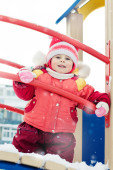 piękny szczęśliwy dziecko w czerwony ciepłej odzieży.