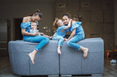 Zdjęcie "wyczerpany matka trzyma niemowlę dziecko i patrząc na kamery podczas niegrzeczna córka gry za" może być wykorzystywane do celów osobistych i komercyjnych zgodnie z warunkami zakupionej licencji Royalty-free. Obraz jest dostępny do pobrania w jakości wysokiej rozdzielczości do 5760x3840.