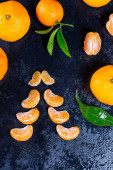 Piękne dojrzałe mandarynki z liści i wody spadnie na ciemnym tle.