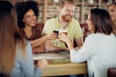 Przyjaciele Dokonywanie toast siedząc w restauracji. Wieloetnicznej grupie.
