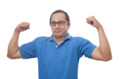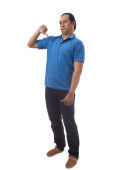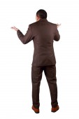 Młody biznesmen sobie biały garnitur i czarne spodnie deperate, patrząc na gest. Na białym tle. Portret całego ciała