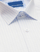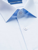 niebieska koszula z naciskiem na kołnierz i guzik, zbliżenie