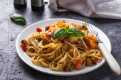 Makaron Spaghetti Bolognese na białym talerzu, drewniany stół.