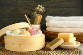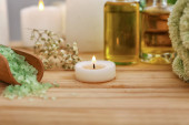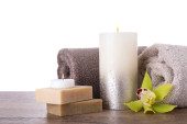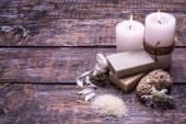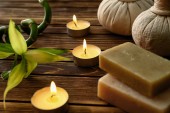 Kompozycja Piękne spa z płonących świec i mydła barów na drewnianym stole