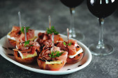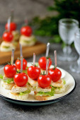 Canape z solonego śledzia, ogórek, gotowanych ziemniaków i pomidorów cherry na żyto grzankami. Boże Narodzenie tło.