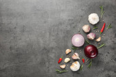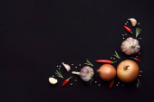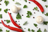 Skład z czosnkiem, rozmarynem i papryką na białym tle, widok z góry. Miejsca na tekst