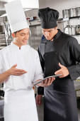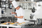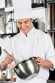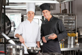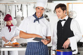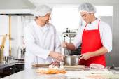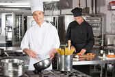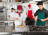 mężczyzna kucharz pomoc koledze w przygotowywaniu jedzenia