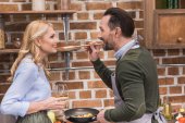 uśmiechający się Starsza żona i mąż, przytulanie i patrząc na kamery przy stole w kuchni