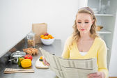 atrakcyjna kobieta w średnim wieku gospodarstwa filiżankę herbaty i czytanie gazety w kuchni