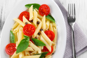 Sałatka z makaronem z pomidorkami i świeżych liści bazylii