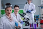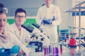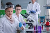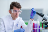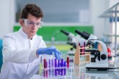 młody student z okularami ochronnymi przeprowadzający eksperyment chemiczny w jasnych laboratoriach, edukacji i medycynie