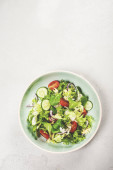 Sałatka Grecka w niebieski płyta na drewniane niebieskie tło. Widok z góry. Miejsce