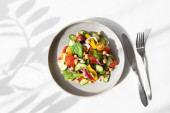 Zdjęcie "Sałatka Grecka w niebieski płyta na drewniane niebieskie tło. Widok z góry. Miejsce" może być wykorzystywane do celów osobistych i komercyjnych zgodnie z warunkami zakupionej licencji Royalty-free. Obraz jest dostępny do pobrania w jakości wysokiej rozdzielczości do 5760x3840.